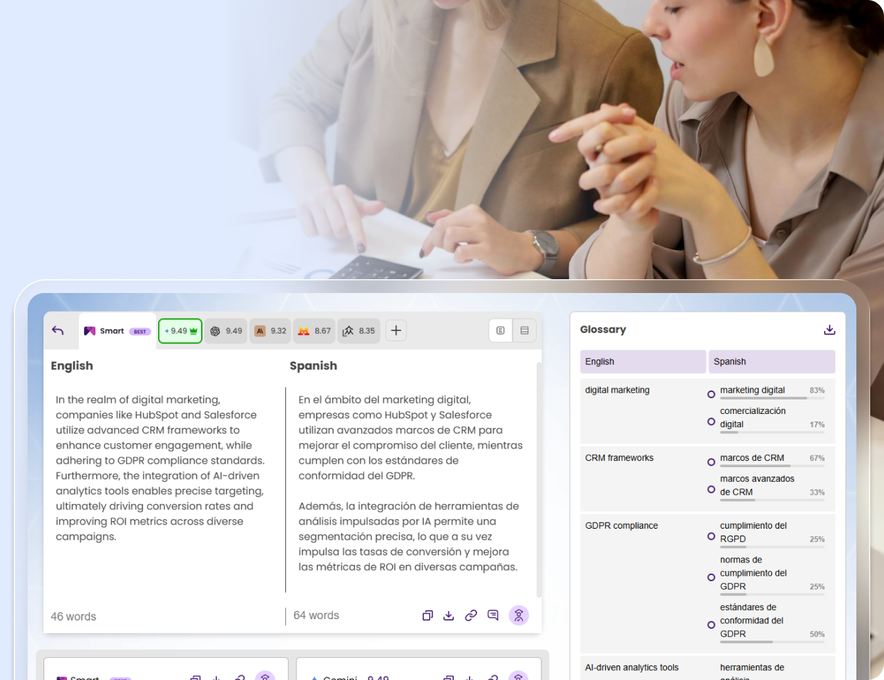• Compare translation results to spot differences in tone, terminology, and meaning before finalizing.